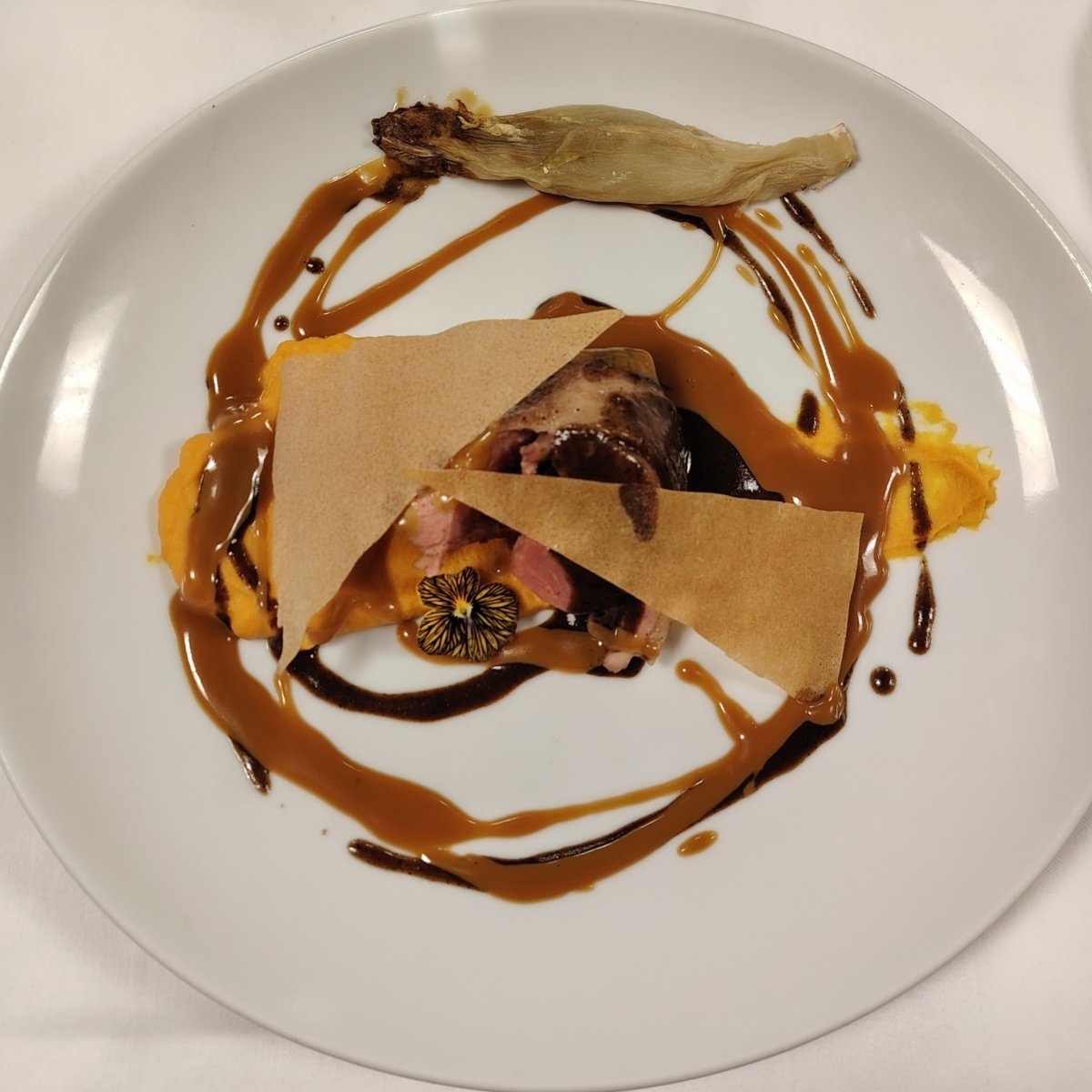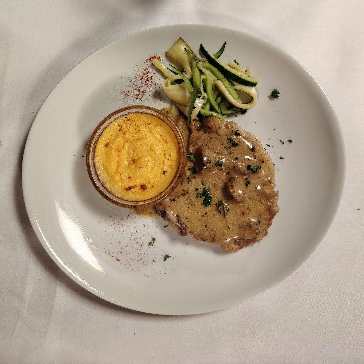 - Côte de veau aux girolles, tagliatelles de courgettes et flan de courge